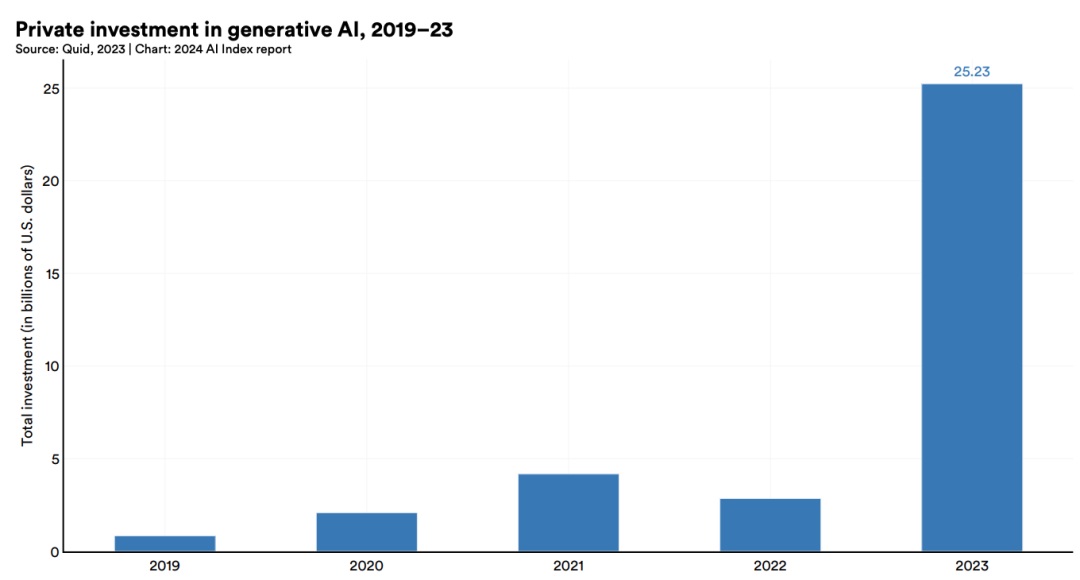 根据斯坦福大学 HAI 的报告,2023 年生成式人工智能初创企业的投资额将达到 252 亿美元,几乎是 2022 年投资额的 9 倍,是 2019 年投资额的 30 倍左右。2023 年,生成式人工智能占所有人工智能相关投资的四分之一以上。