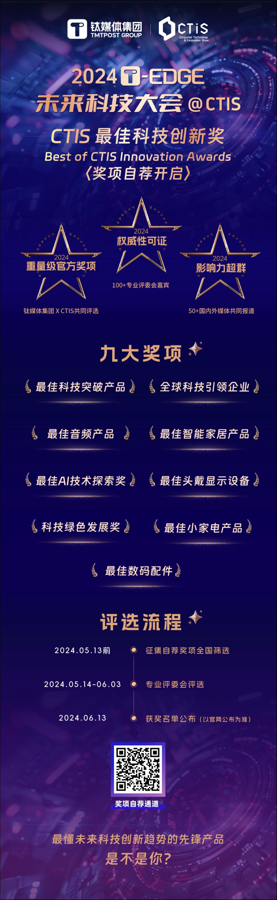CTIS 最佳科技创新奖自荐报名正在进行中,立即报名,点击链接:https://www.tmtpost.com/event/dzb/7011574