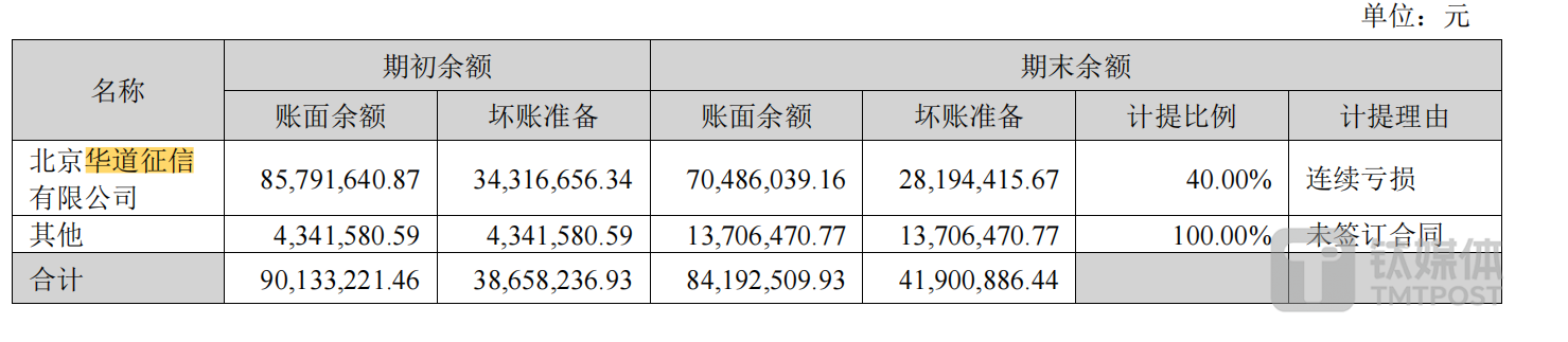 财报显示,2023年,公司对华道征信应收款的期末账面余额为7048万元,坏账准备2819万元,计提比例高达40%,计提理由为连续亏损。据了解,华道征信2023年实现营业收入9902.4万元,净利润为-527.72万元。