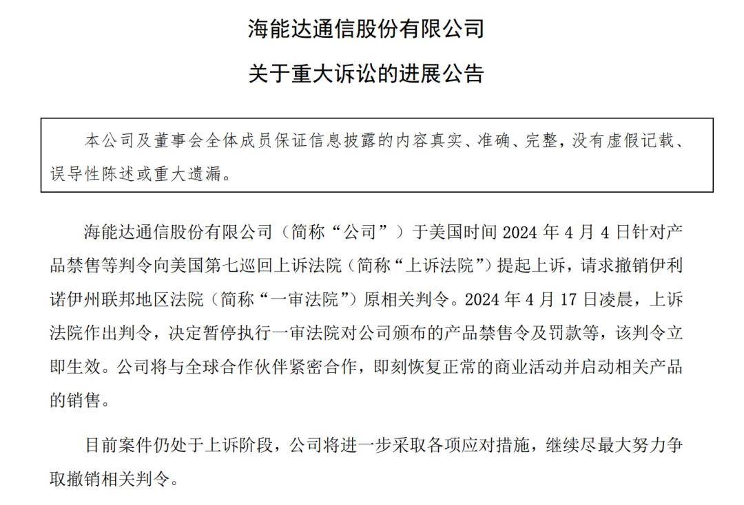 这番运筹帷幄效果显著,海能达在4月17日等来了上诉法院的判令,前述禁售令以及罚款被暂停执行,海能达也开始了正常的商业运转。