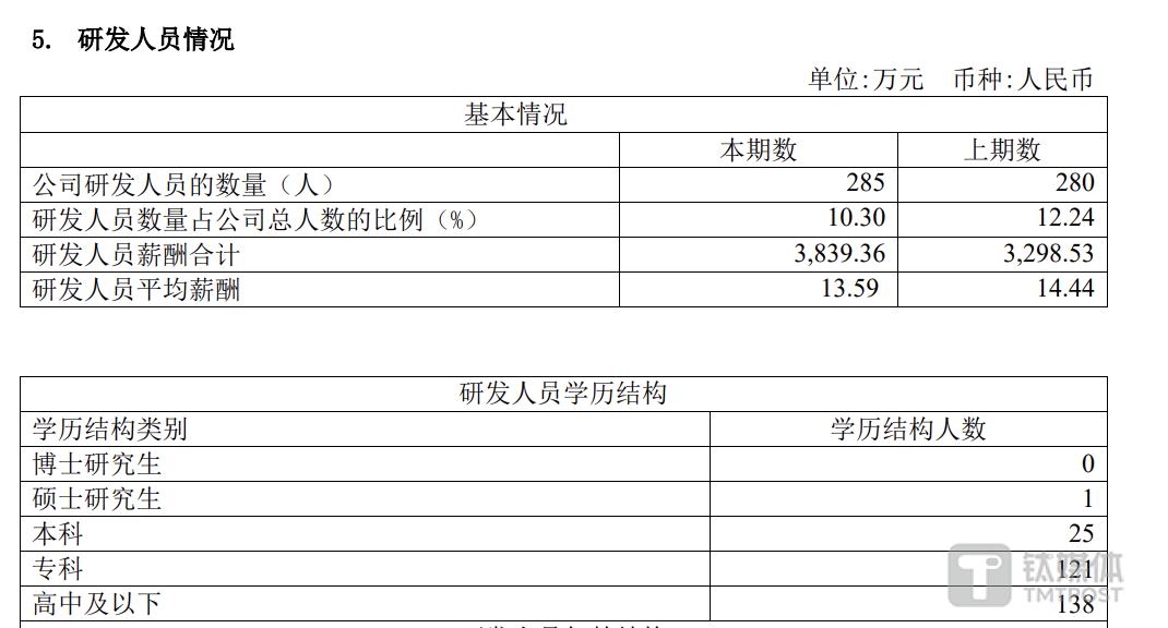 但钛媒体APP注意到,公司的研发团队学历不高,且研发人员的学历主要集中在高中及以下。具体来看,2023年,公司共有285名研发人员,其中学历在本科及以上有26人,占比不足1成。学历在专科、高中及以下的人数分别为121人、138人,两者合计占研发人员的比例超过9成。