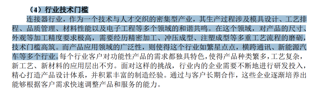 从行业上来看,鼎通科技在2023年年报指出,公司所处的连接器行业是一个技术与人才交织的密集型产业,其生产过程涉及模具设计、工艺排程、品质管理、材料性能以及电子工程等多个领域的和谐共鸣。在这个领域,对产品的尺寸、外观等加工精度要求极高,需要经历精密加工、冲压成型、注塑成型等多重工艺流程的磨砺,技术门槛高筑。