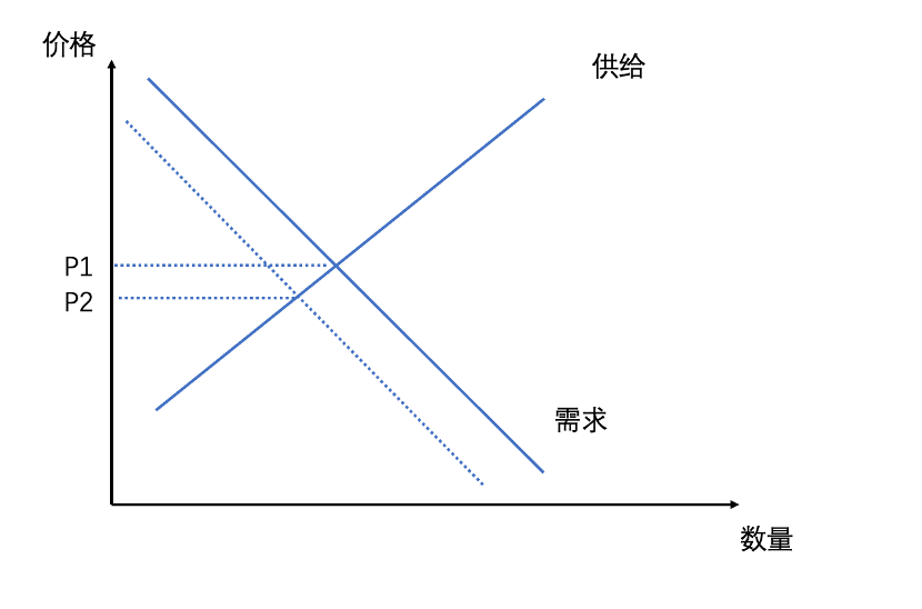 我们知道供需关系决定价格,当市场受外部冲击价格迅速下降偏离公允价格时(一些甚至商家无利润出货),价格由P1降到P3,若供需关系不发生太大变化,此时一部分需求将因为供给不足而无法满足(P3实线部分),与之所对应的乃是P2,价格高于市场公允价格,面临需求不足的问题(如淘天)。