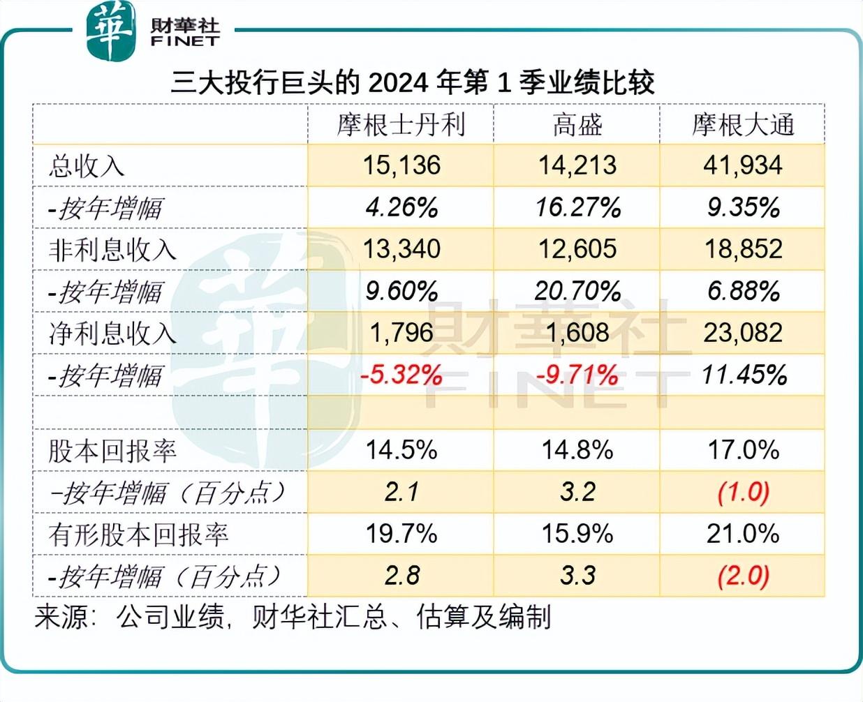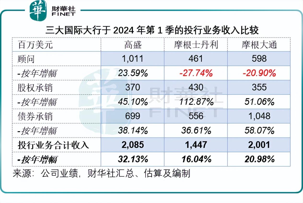 2024年第一季度,高盛的投行业务在并购、出售、分拆等交易顾问服务领域继续保持其显著优势,摩根士丹利则在股权市场方面展现出其独特的竞争力,而摩根大通在商业银行服务领域拥有规模优势,其在债券承销业务方面的表现亦将更为出色。