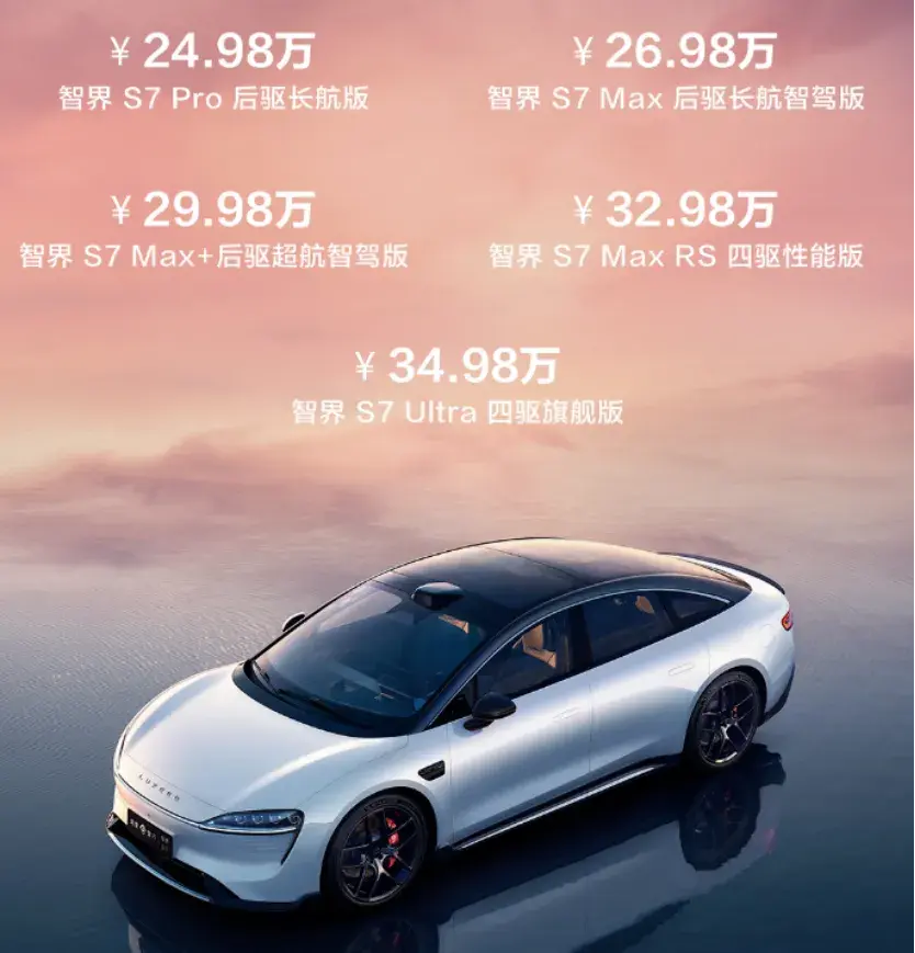 据了解,重新发布的智界S7共推出5款车型,其中新增加了S7 Ultra作为高配,官方指导价为24.98万至34.98万元,价格区间与老款保持一致。