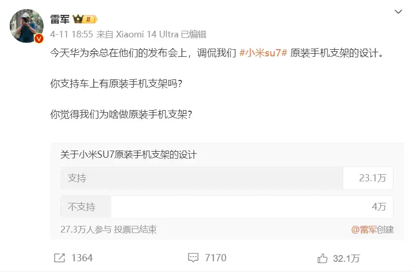 对于余承东言论,雷军在微博发文称:“华为余总在他们的发布会上,调侃我们小米SU7原装手机支架的设计。”同时,雷军还提问并发起投票:你支持车上有原装手机支架吗?你觉得我们为啥做原装手机支架?