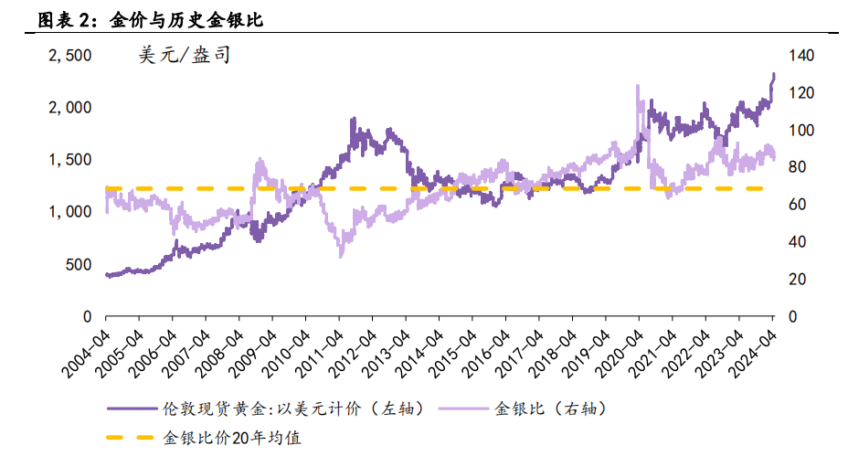 1、白银正重新定价。白银定价以黄金为锚,金价持续上涨后,当前金银比价处于历史高位,最近20年金银比均值为68.3,而目前金银比已超过83.4。远超历史均值的金银比,也让白银配置变得越来越具有性价比。