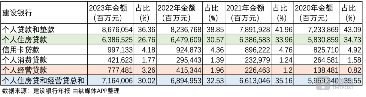 经营贷还没“火”之前,大家还是老老实实“专贷专用”,但近3年来这中间的“暗箱操作”导致银行个贷数据存在一定偏差。以建设银行历年经营贷数据为例,在2019年以及之前的年报中几乎没有提及个人经营贷相关的事宜,直到2020年起该数据开始统计入个人贷款项目中,可以发现不管是绝对数额还是在个人总贷款中的占比,个人经营贷都是大幅上涨;相比之下,近3年来,个人住房贷每年占个人总贷款的占比下滑3%左右,甚至2022年个人住房贷款的绝对金额超过2023年;将二者合并起来看的话房贷的降幅不再那么显著,绝对金额保持提升。