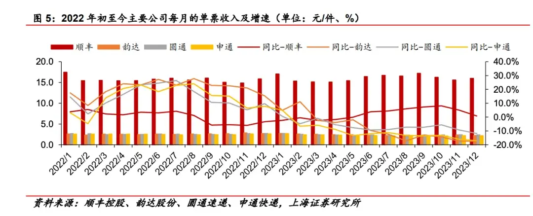 2023年,申通和韵达单票收入持续下滑 图源:上海证券研报