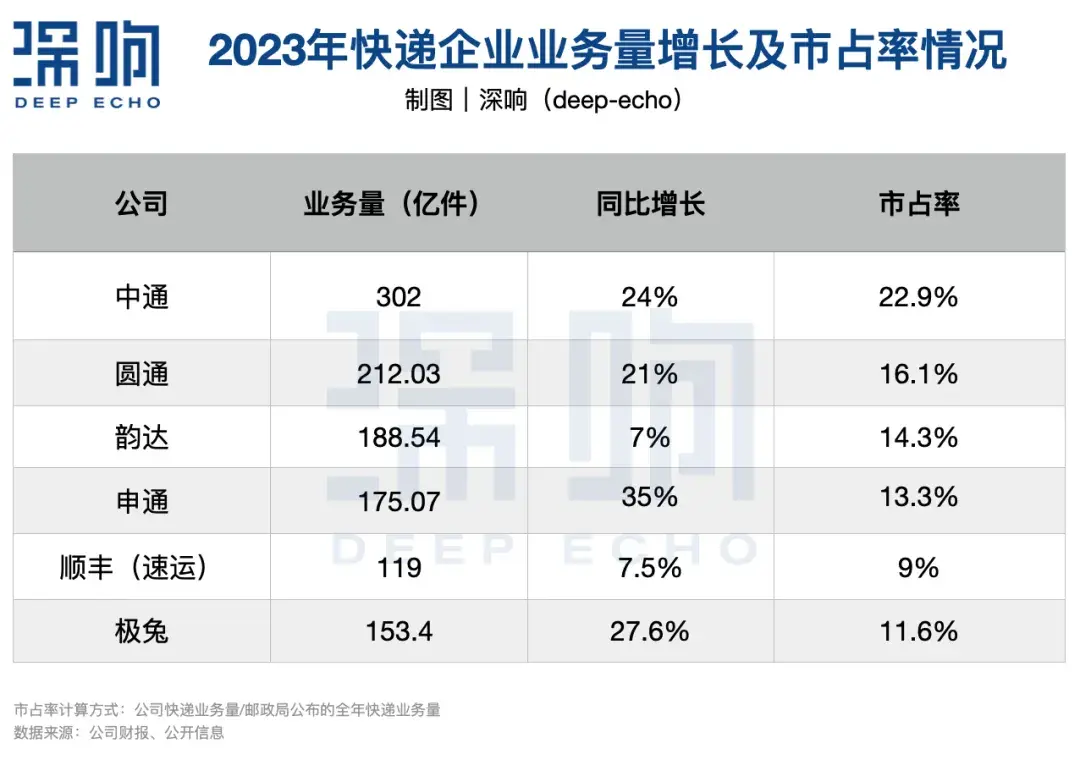 在“快递企业”赛道上,根据公开数据计算,2023年全年,中通、圆通、韵达、申通、极兔、顺丰(速运)的市占率分别为22.9%、16.1%、14.3%、13.3%、11.6%和9%。