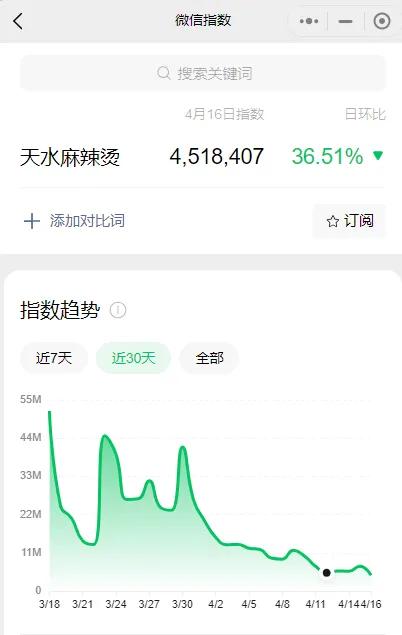 进入4月,“天水麻辣烫”热度呈现下滑趋势,截至4月16日,指数日环比下降36.51%。天水麻辣烫在社交平台上的热度下滑,消费者的尝鲜劲也跟着下滑,不少麻辣烫门店的生意也正是从这个节点开始出现落差的。