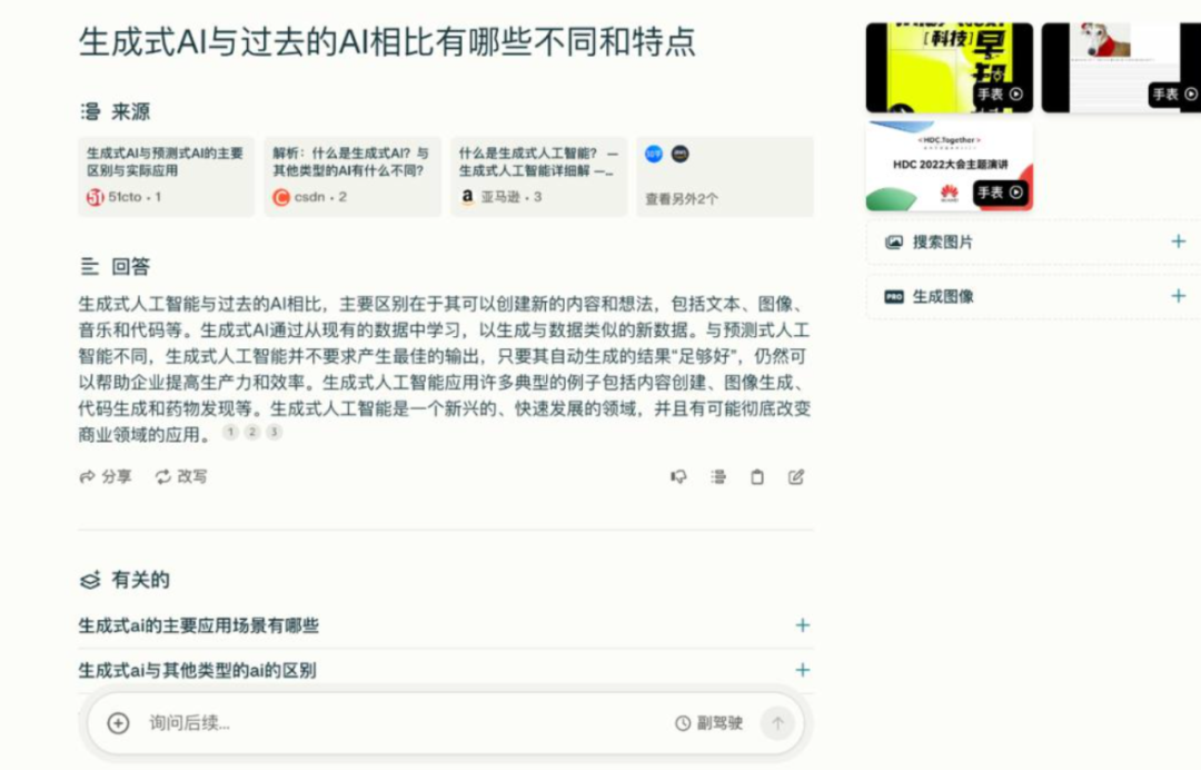 当用户向Perplexity提问时,会得到Perplexity的相应回答。这个答案是通过网上已有的信息总结提炼而来。在回答栏目的上方,Perplexity还会给出参考内容的来源,并支持点击。在回答的下方,Perplexity预测了几个用户可能会追问的问题,点击后页面继续向下展开对于该问题的答案,用户也可以自行进行提问。
