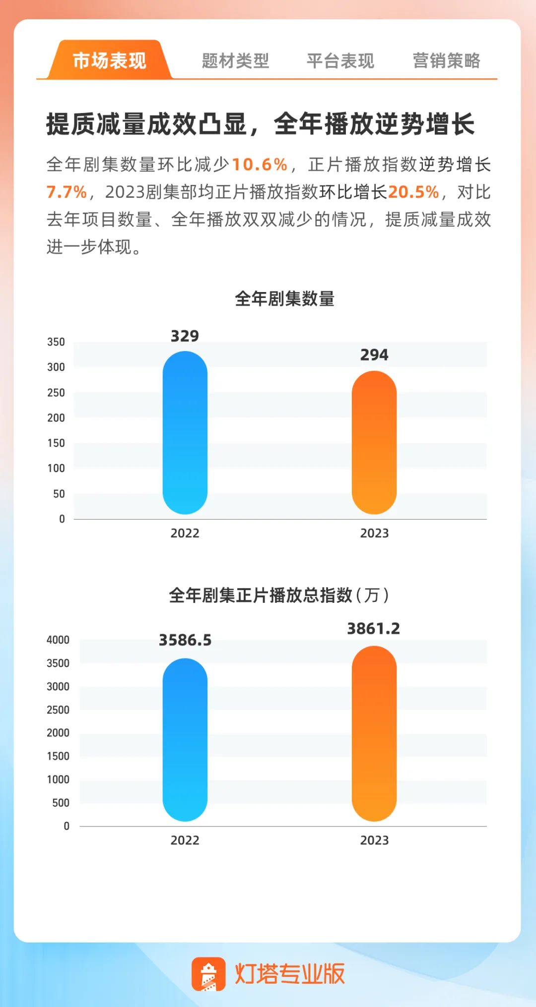 另一方面,剧集公司手中握有的IP资源、版权资源也能在短剧市场扩张下有更多发挥空间。长剧集市场的“提质减量”明显,灯塔专业版《2023年度剧集市场报告》显示,2023全年网播剧集市场有效剧集数量294部,较去年减少10.6%,大盘正片总播放指数3861.2万逆势增长7.7%,可见目前长剧市场有些倾向于头部大剧通吃流量的模式。