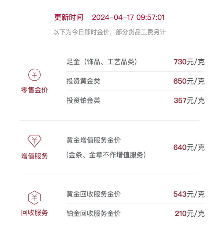 老凤祥和周大福等品牌一向好牌好货好价格,673/克的均价加上加工费,就让一款上手稍显单薄、款式并不突出的的黄金细手链接近万元,换算下来,就是四线城市两个半月的平均工资。