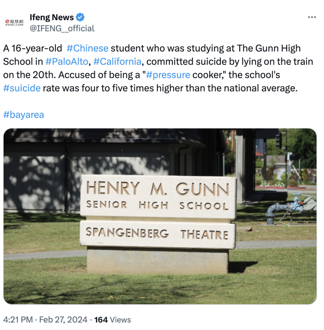今年二月份,一个16岁的华裔女高中生卧轨自杀,让硅谷的高中在美国互联网又引起了讨论。