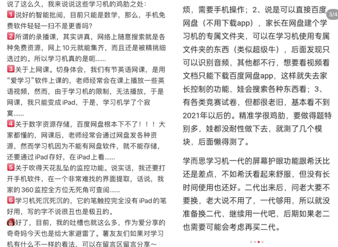 另有家长总结学习机的鸡肋之处称:“说好的智能批阅,手机免费软件轻轻一扫不是更香吗;所谓的录播客,其实讲真,网上随意搜索就是免费资源……”