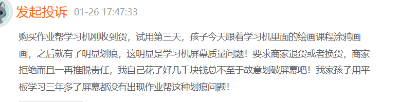 不仅是学而思,在黑猫投诉上,也有不少消费者指出作业帮学习机的硬件问题。其中有消费者投诉称:购买作业帮学习机刚收到货,试用第三天,孩子今天跟着学习机里面的绘画可成涂鸦画画,之后就有了明显划痕,这明显是学习机屏幕质量问题。另有消费者则提到自己购买的学习机使用三个月后屏幕自爆。