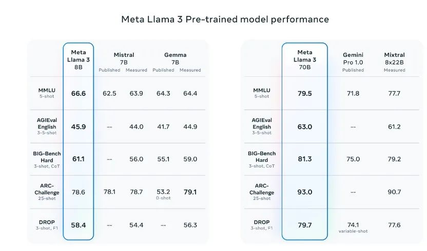 从发布的信息看,Llama 3公布了10项标准测试基准的表现,其中在与70亿参数级的Mistral 7B模型和Google Gemma 7B模型对比中,Llama 3在9项标准测试基准上都有着更好的表现。