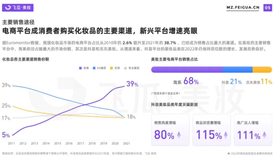 潘雨润所在的美妆赛道,也是一个非常特殊的赛道。美妆在直播带货发展的初期就已经是强势品类,于是也成为了“兵家必争之地”。各个平台之间对美妆品牌主的抢夺,很大程度上能造福平台中的美妆主播。比如抖音近些年就在大力挖掘美妆赛道的潜力,据飞瓜数据《2022年美妆短视频及直播电商报告》,2022年抖音美妆商品在泛商城场景中产生的GMV相比2021年增长491%,渠道份额提升至16%。