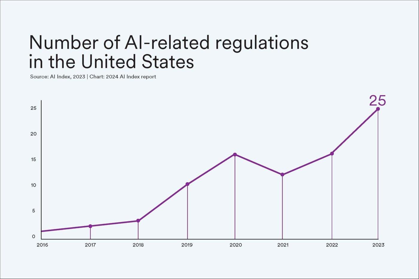 In 2016, there was a single AI-related regulation in the U.S. By 2023, there were 25, a rise of 56.3% from the number in 2022.