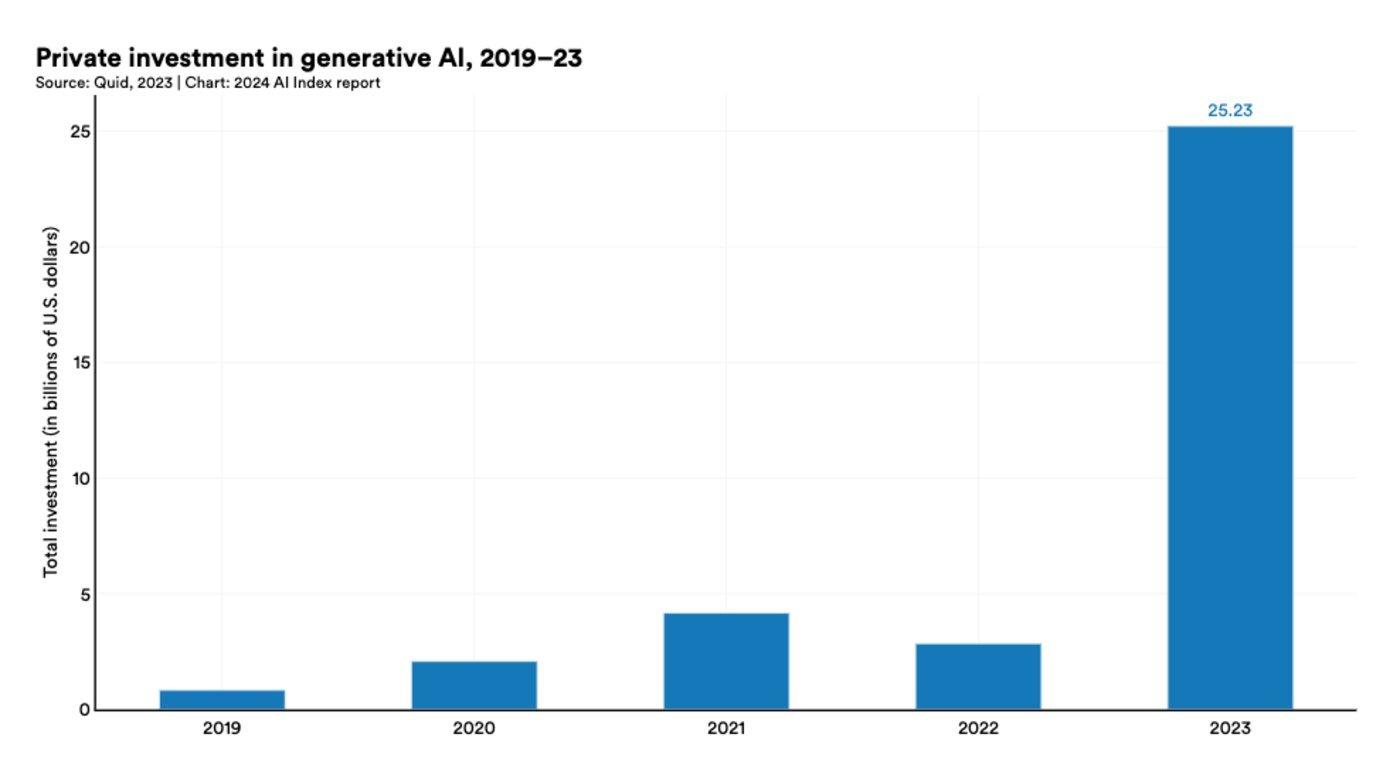 Despite a decline in overall AI private investment last year, funding for generative AI surged, nearly octupling from 2022 to reach $25.2 billion. Major players in the generative AI space, including OpenAI, Anthropic, Hugging Face, and Inflection, reported substantial fundraising rounds.