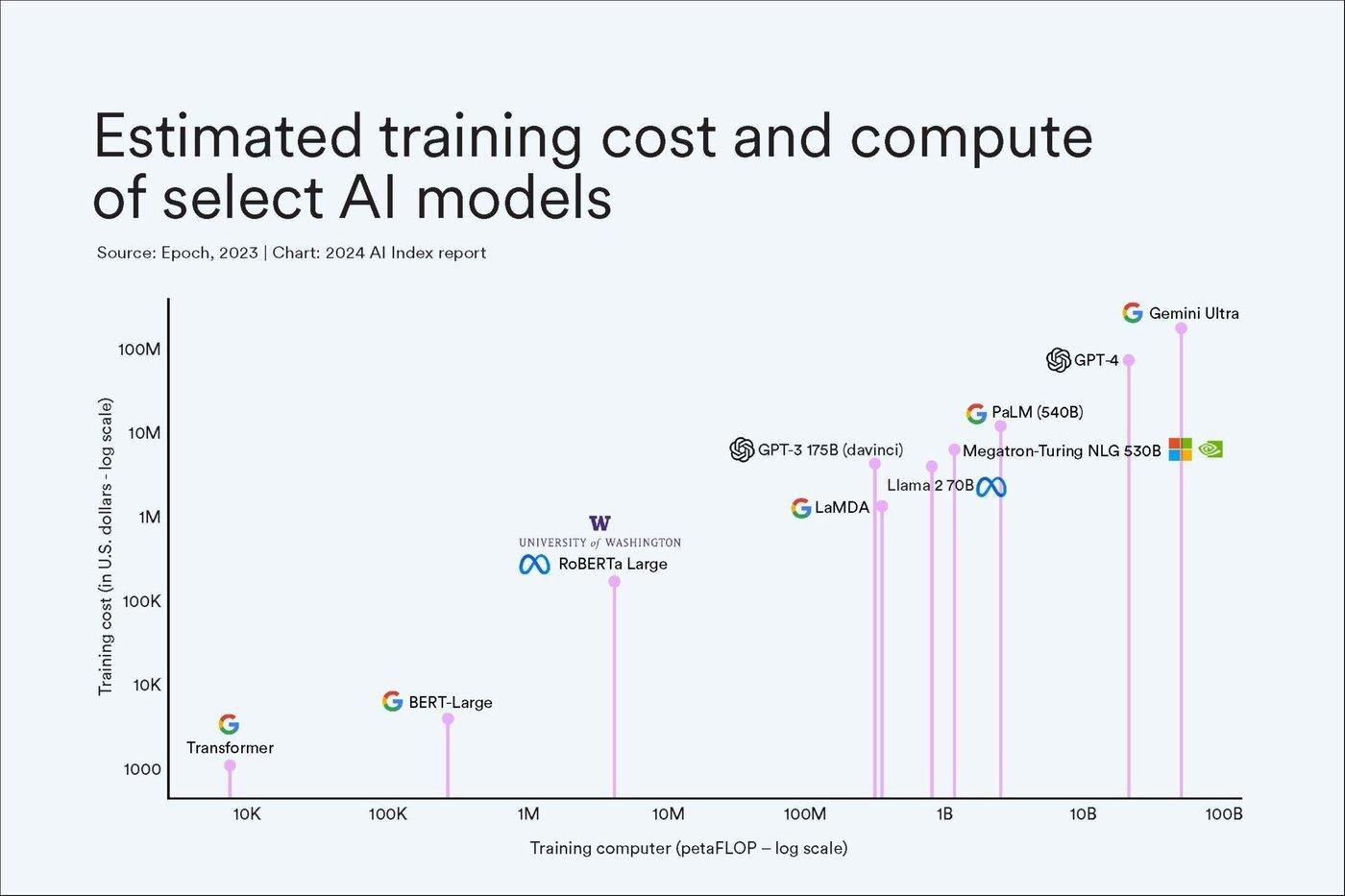 Training costs for state-of-the-art AI models are unprecedented. Examples given are the estimated $78m of compute used for OpenAI’s ChatGPT, and $191m for Google’s Gemini Ultra.