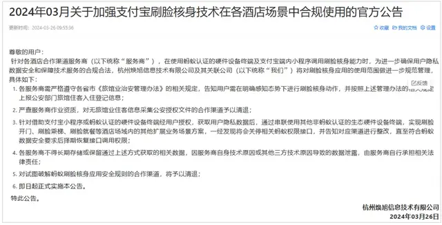 早在3月,支付宝服务商平台就公布了《加强支付宝刷脸核身技术在各酒店场景中合规使用的官方公告》。