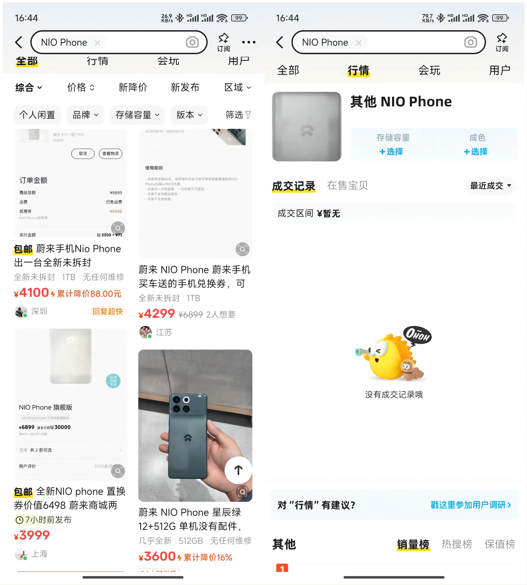 要知道,蔚来手机上市后,无论是销量还是口碑,表现都非常一般,而且原价6499元起NIO Phone,目前闲鱼平台基本在4000元左右。最离谱的是,行情页面显示,由于最近没有成交记录,所以查询不到价格,看来二手都没人愿意买。