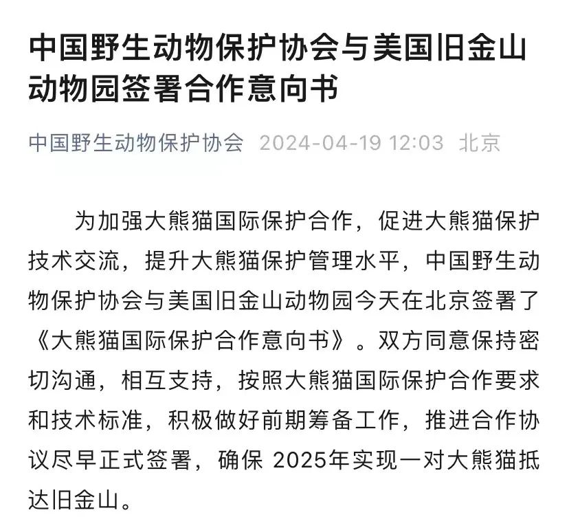 4月19日,据中国野生动物保护协会微信公众号发布信息显示,其已与美国旧金山动物园在京签署了《大熊猫国际保护合作意向书》,确保2025年实现一对大熊猫抵达旧金山。