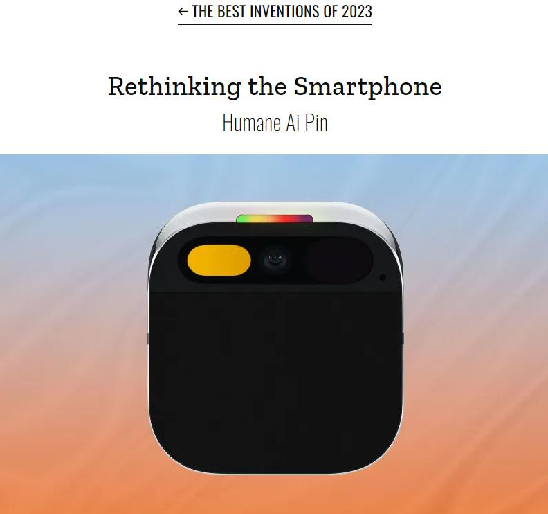 甚至在产品完全没有开售的 2023 年,Ai Pin 就被《时代》杂志评选为 2023 年年度创新产品。