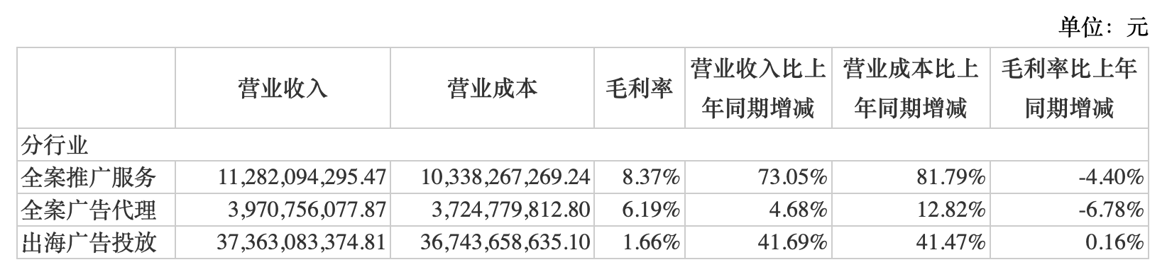 分板来看,去年蓝色光标全案推广服务营收同比大增73.05%,达到112.82亿元;全案广告代理业务营收增7.55%,来到39.71亿元。