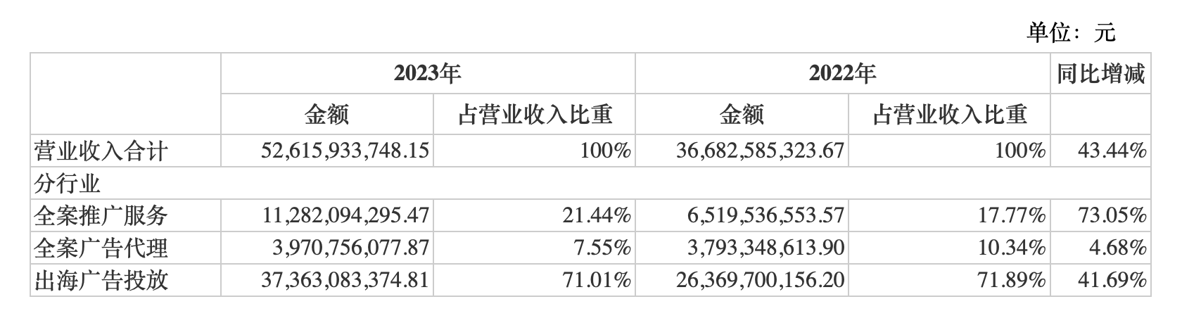 而公司去年表现最为亮眼的是出海广告投放业务。作为核心收入来源,该业务2023年实现营收373.63亿元,同比增长41.69%,占总收入的比例为71.01%。蓝色光标表示,2023年其代理Meta和Google的广告收入增长率保持在两位数,毛利率也在日趋激烈的竞争环境下稳中有升。