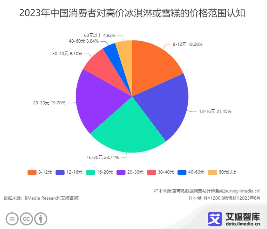 艾媒咨询“2023年中国消费者对高价冰淇淋或雪糕的价格范围认知”调查显示,在价格范围认知方面,消费者对高价冰淇淋或雪糕的价格接受范围较广,从8-20元的价格都有一定比例的消费者选择。其中,选择8-12元、12-16元、16-20元的消费者比例较高,分别为18.28%、21.45%、23.71%。