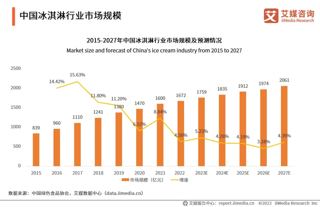 艾媒咨询数据则显示,预计2023年我国冰淇淋行业市场规模将达到1759亿元。