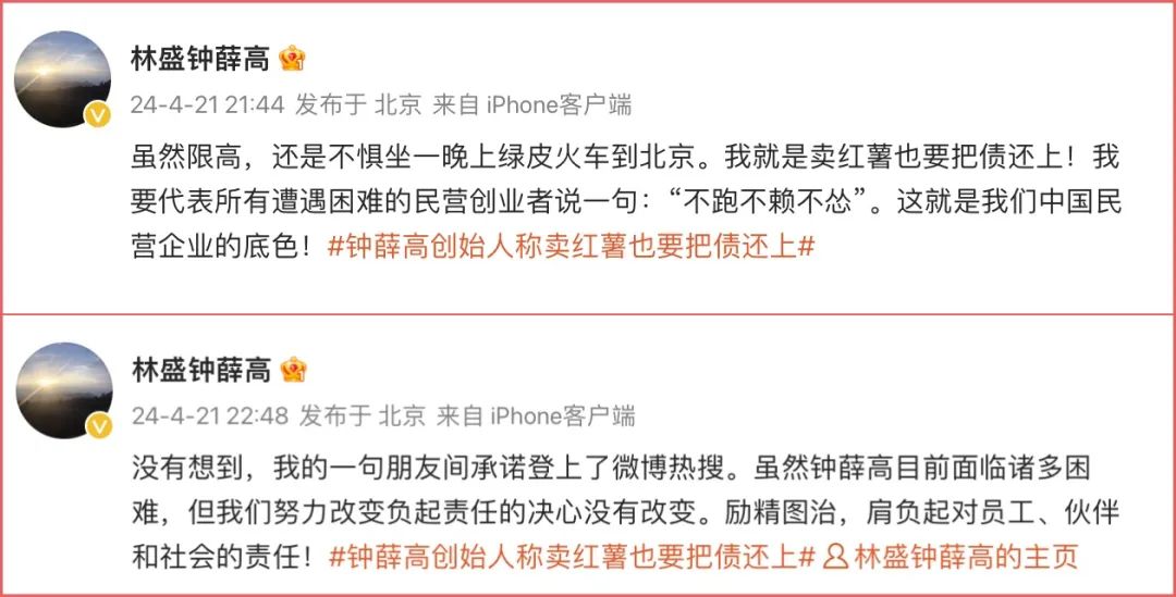 同日稍晚,林盛连续发布两条微博,强调“不惧坐一晚上绿皮火车到北京”“我就是卖红薯也要把债还上”。两条微博均挂上#钟薛高创始人称卖红薯也要把债还上#的话题,该话题经过发酵后登上热搜榜。