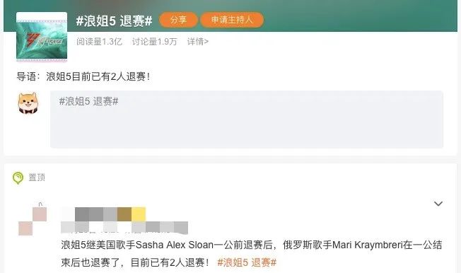 真正将“浪姐5”推上风口浪尖的,是国际姐姐的“退赛”新闻。3月末#浪姐5 退赛#的话题冲上热搜,阅读量达到1.3亿,原因是据媒体报道美国歌手sasha和俄罗斯歌手玛丽先后退赛。目前退赛原因尚未公布。