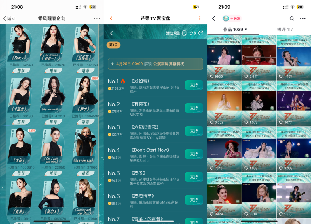 另一方面,节目组也在有意识增加传统文化的含量。最典型的,这一季节目的公演将以惊蛰、夏至、立秋、大雪在内的“东方节气”为主题。只是传统节气将如何与舞台融合,还是沦为宣传噱头,也将成为焦点议题。目前释出的一公表演舞台有《发如雪》《雪落下的声音》等古风歌曲,也有原创、小甜歌等。