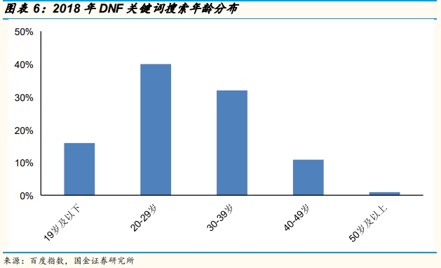回顾DNF国服的兴起,其中有偶然,但更多是必然。虽然腾讯官方从未公布过DNF国服玩家的画像数据,但国金证券研究所发布的《DNF游戏专题分析报告》显示,其基于百度搜索指数统计的搜索DNF相关内容用户群中,20-29岁占比最高,达到40%,其次是30-39岁,占比为33%。
