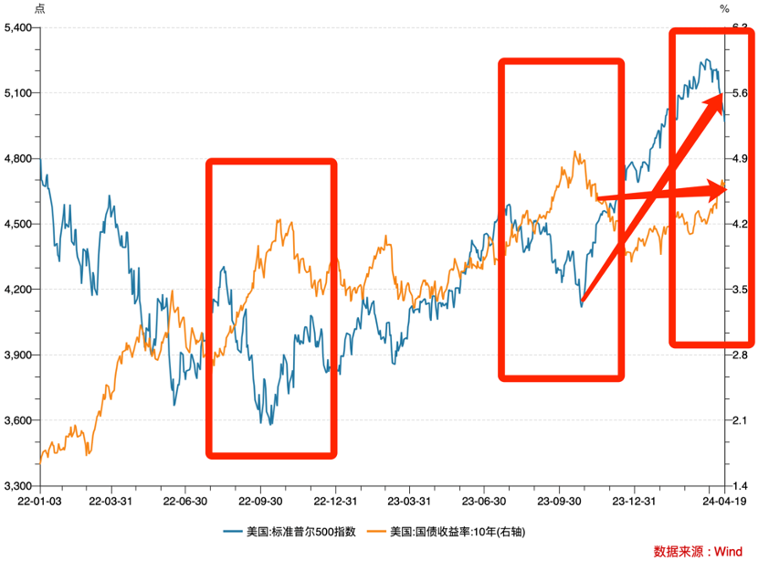 2)美十年国债收益率在大涨之中确实对标普500指数带来极大的负面效应,若拉长时间线,标普500又是在利率中枢上行中创历史新高,进入2024年之后,在利率市场相对平淡之时,标普500陡然上升。