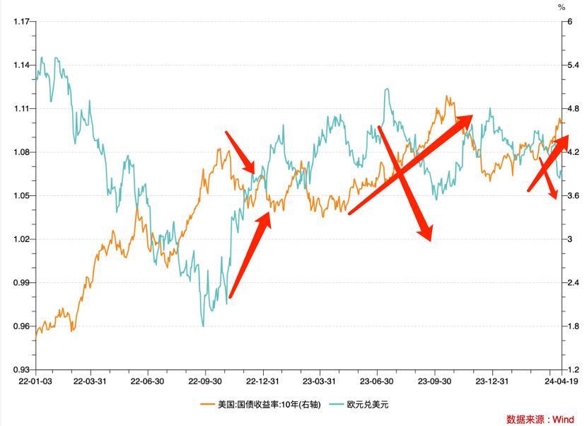 欧洲金融市场在过去两年可谓是跌宕起伏,扣人心弦,尤其美联储开始加息与“俄乌战争”撞车,让欧元在2022年初经历了一次过山车般的贬值,2023年9月兑美元跌到历史低点,在交易端,此时的操作应该为“卖出欧元——买入美元”,大量美元汇市中被收回,在价格和数量双重因素作用下,美元的流动性受到严重抑制,十年国债收益率由此进入上涨快车道。