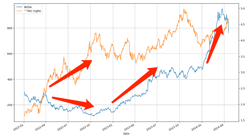 在上图中英伟达和美十年国债收益率分道扬镳于2023年,彼时ChatGPT大热,AI算力需求激增,GPU需求量剧增,英伟达供不应求成为当红炸子鸡,在“市值=利润*市盈率”公式中,企业进入高光时代,市盈率和利润预期双双上扬。