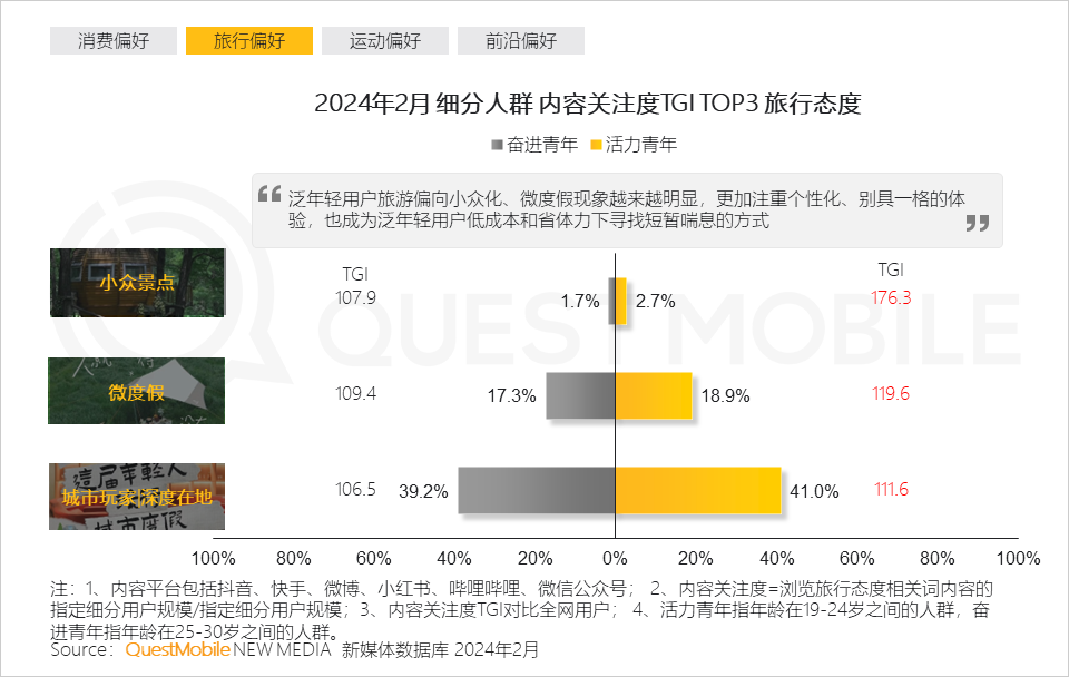 2.4 小众景点凸显活力青年对独特的追求、希望别具一格的体验,深度在地和微度假的模式,也成为泛年轻用户低成本和省体力下寻找短暂喘息的方式