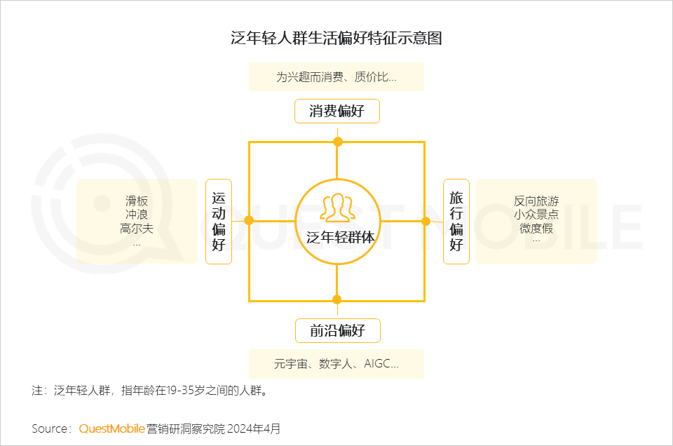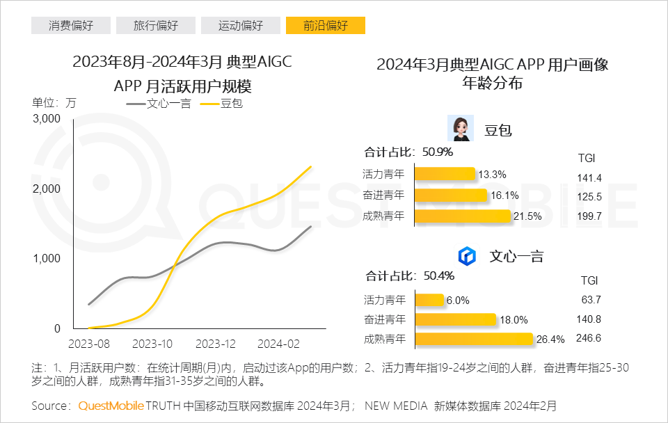 同时,不同年龄段偏好也呈现细微差异,19岁到24岁更具活力,对演出、手游、理性消费更为偏好;25岁到30岁表现出更强的奋进精神,商务办公、生活服务、AIGC新技术等活跃度都很高;30岁到35岁则表现出成熟偏好,百度贴吧、盒马、闲鱼等是热门应用,精致养生成为热词……