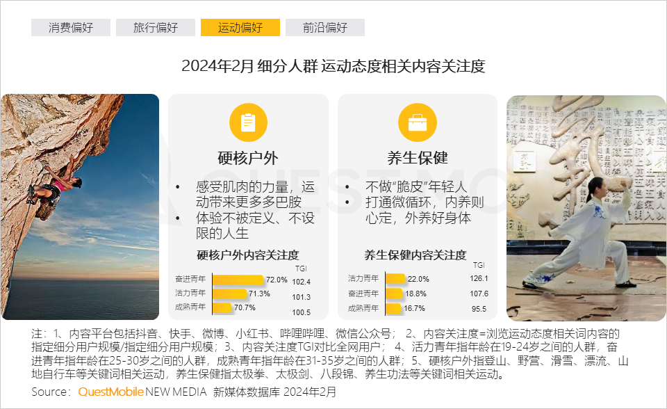 奋进青年对越野跑、攀岩、陆冲等硬核户外运动方式偏好度更高,而八段锦、金刚功等养生保健类运动方式受到活力青年的追捧。