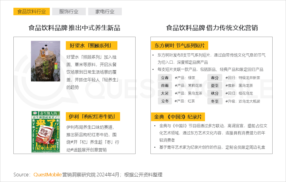 3、食品饮料品牌一方面推出中式养生新产品,满足年轻人的养生需求,另一方面深度绑定中国传统文化,引发年轻人文化共鸣