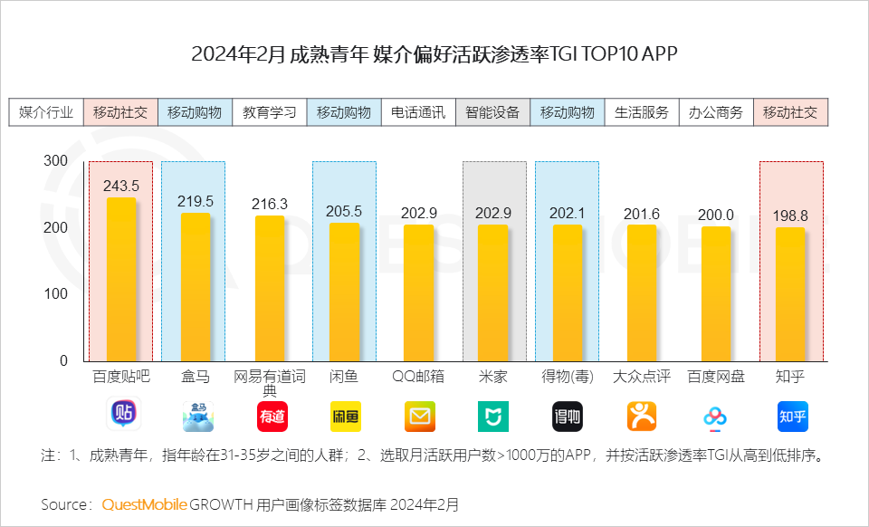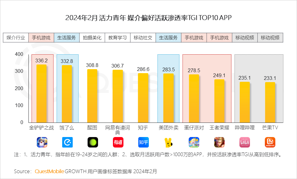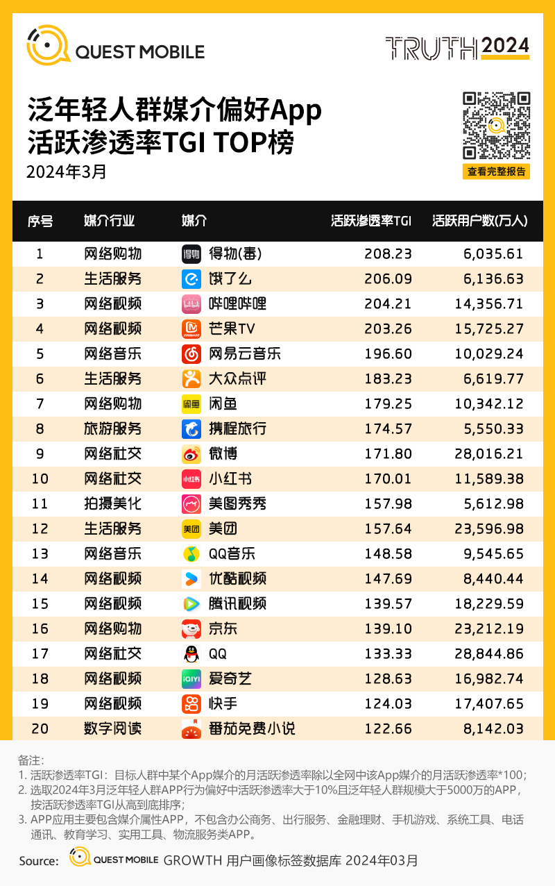 1、泛年轻人群媒介偏好APP活跃渗透率TGI TOP榜