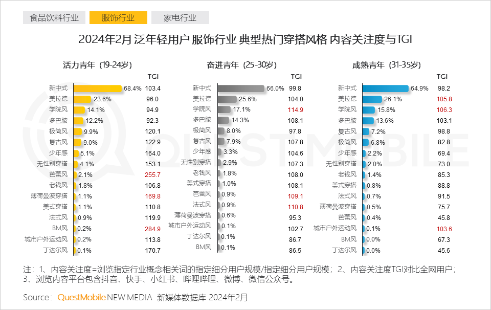 活力青年对芭蕾风、薄荷曼波、BM风关注度偏好明显高于大盘,其潮流敏感度更高,愿意尝鲜;奋进青年及成熟青年对学院风的高TGI表现,代表将青春元素融入通勤场景中是两批用户共同的诉求。