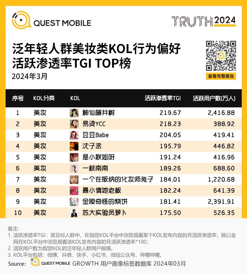 4、泛年轻人群美妆类KOL行为偏好活跃渗透率TGI TOP榜