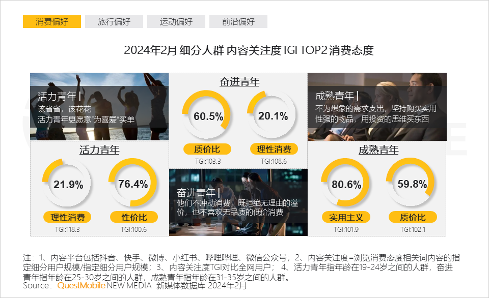 2.3 活力青年理性消费意识更强,奋进青年则理性与质价比共存,成熟青年更在意质量和实用消费主义