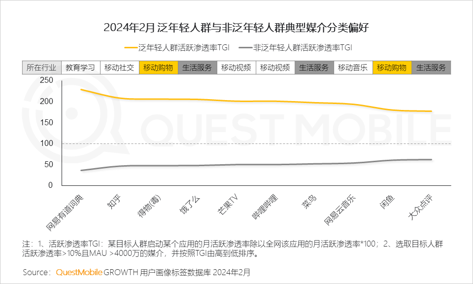 1、泛年轻人群规模小幅攀升,移动购物与生活服务媒介更容易触达年轻人群